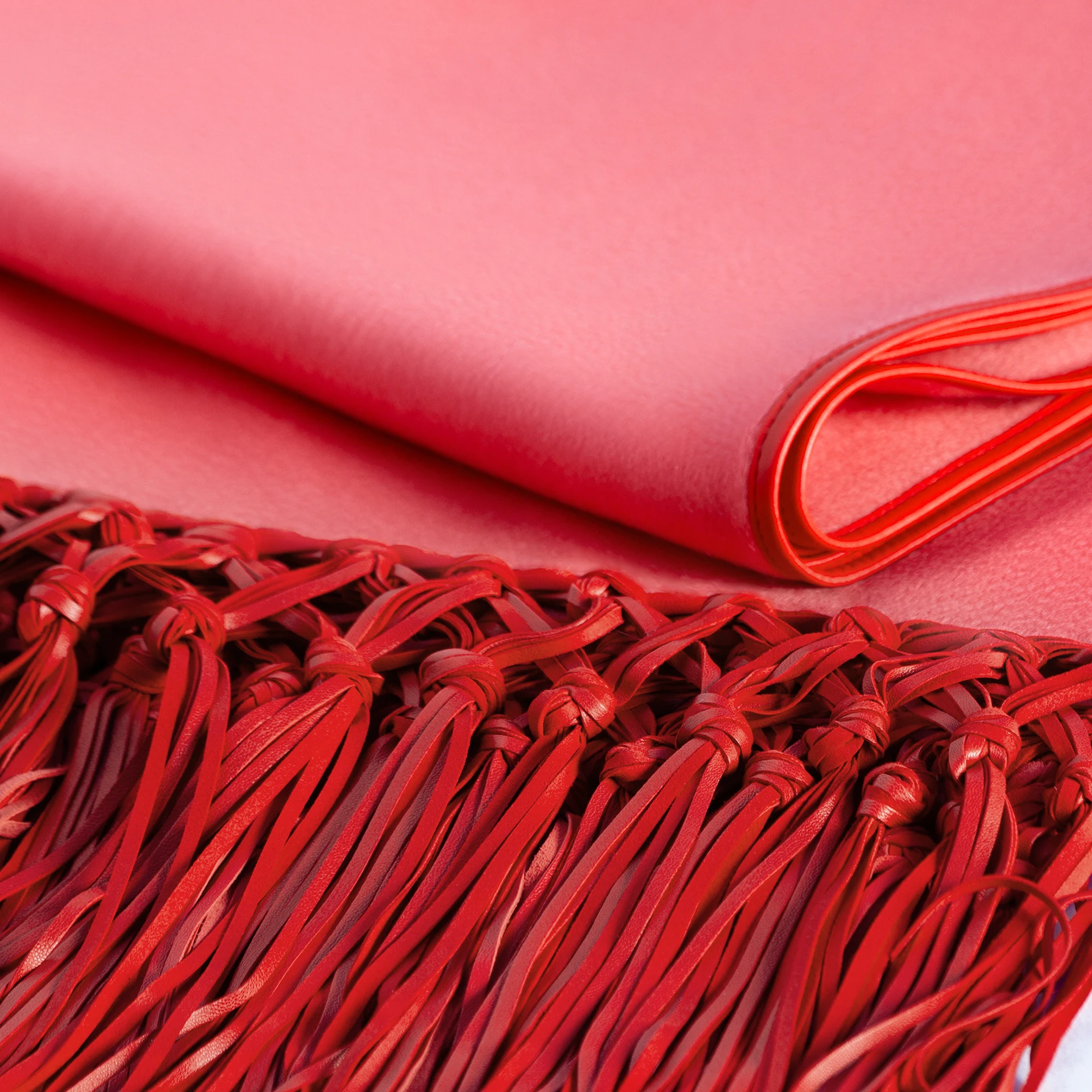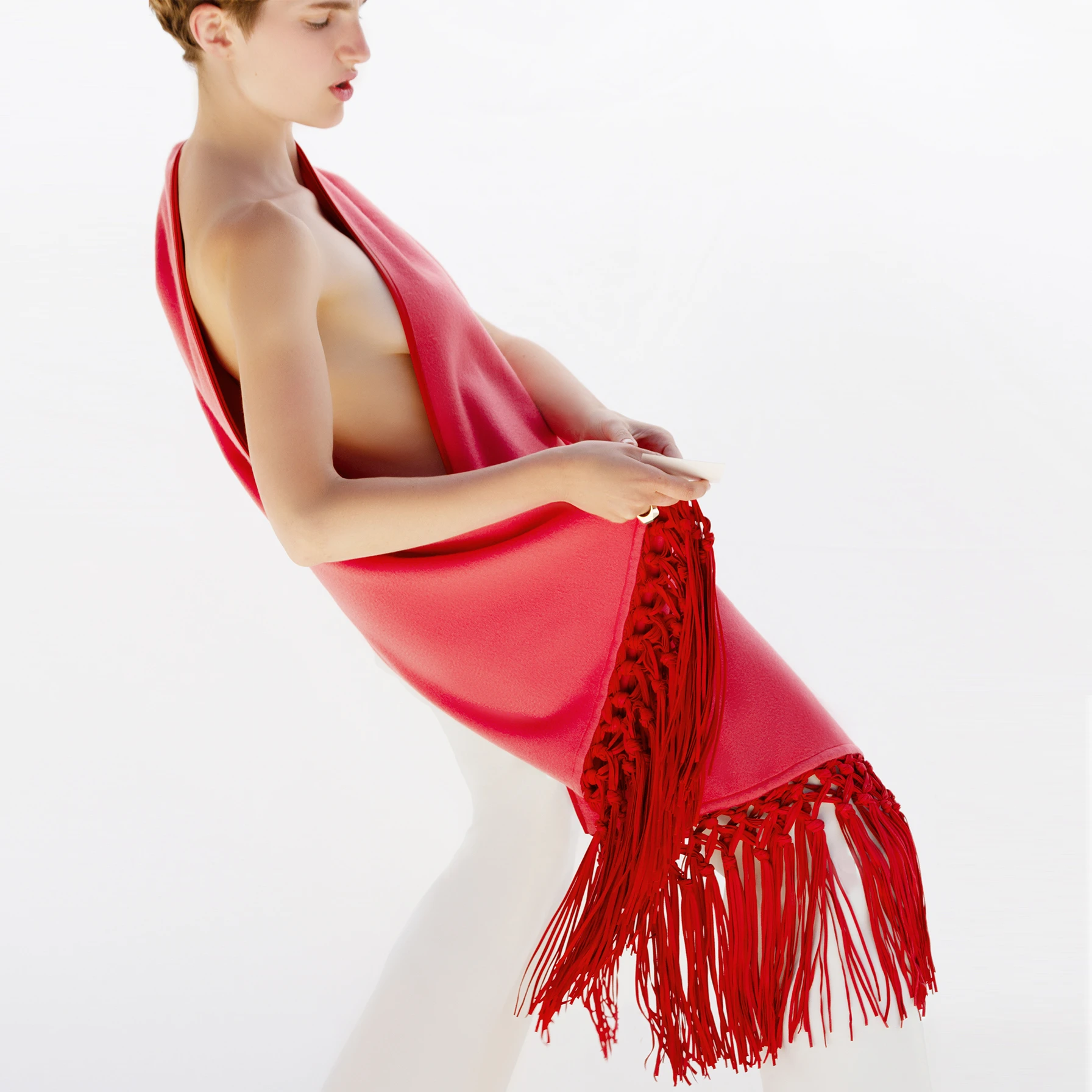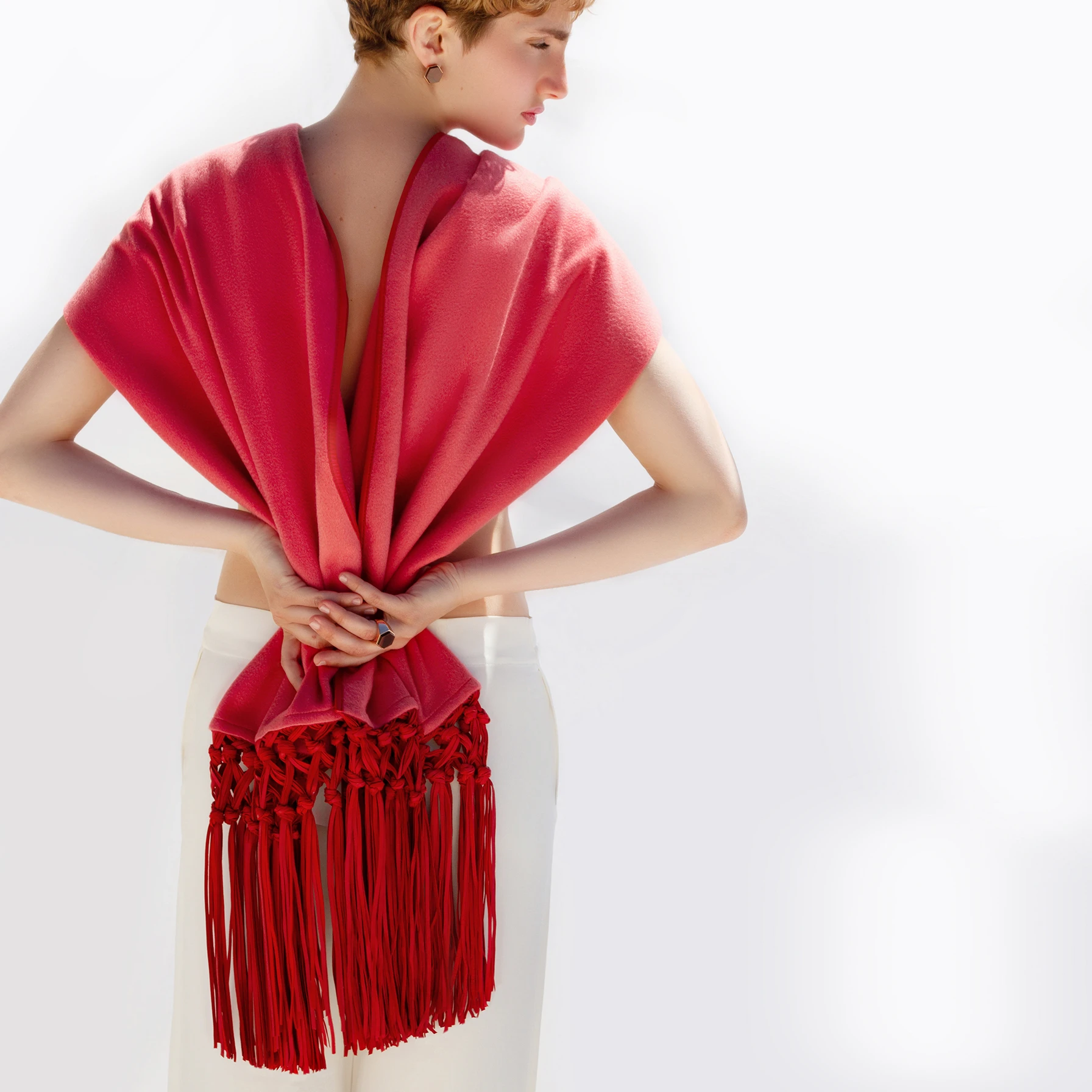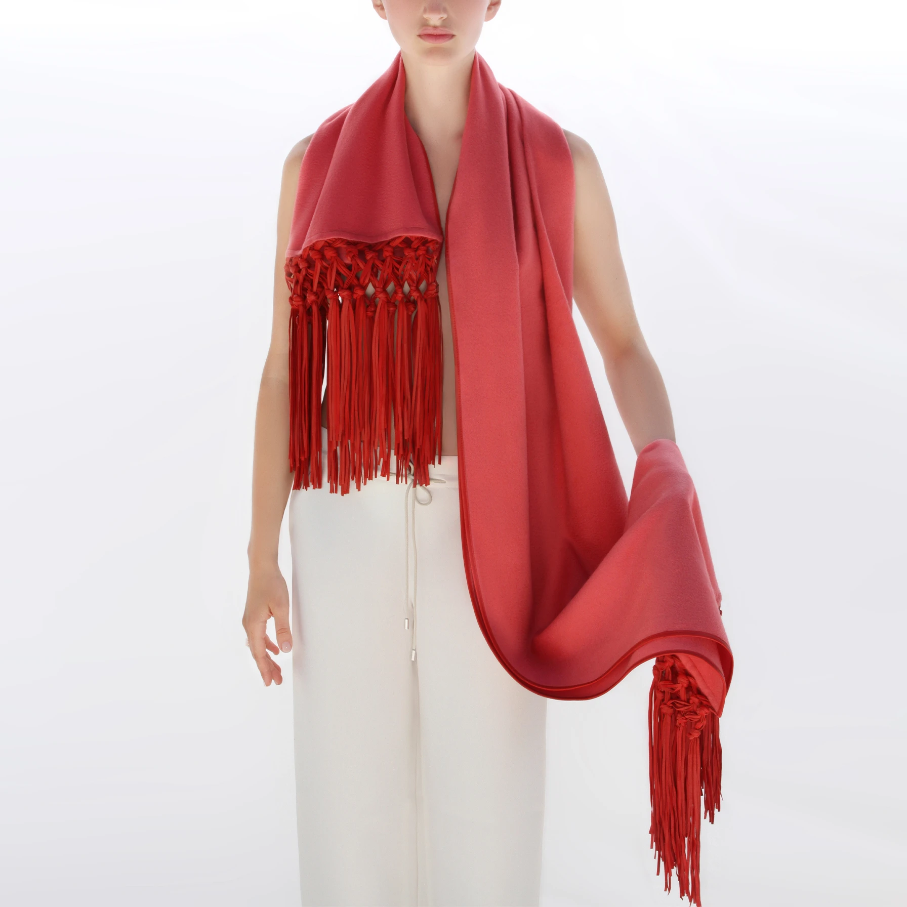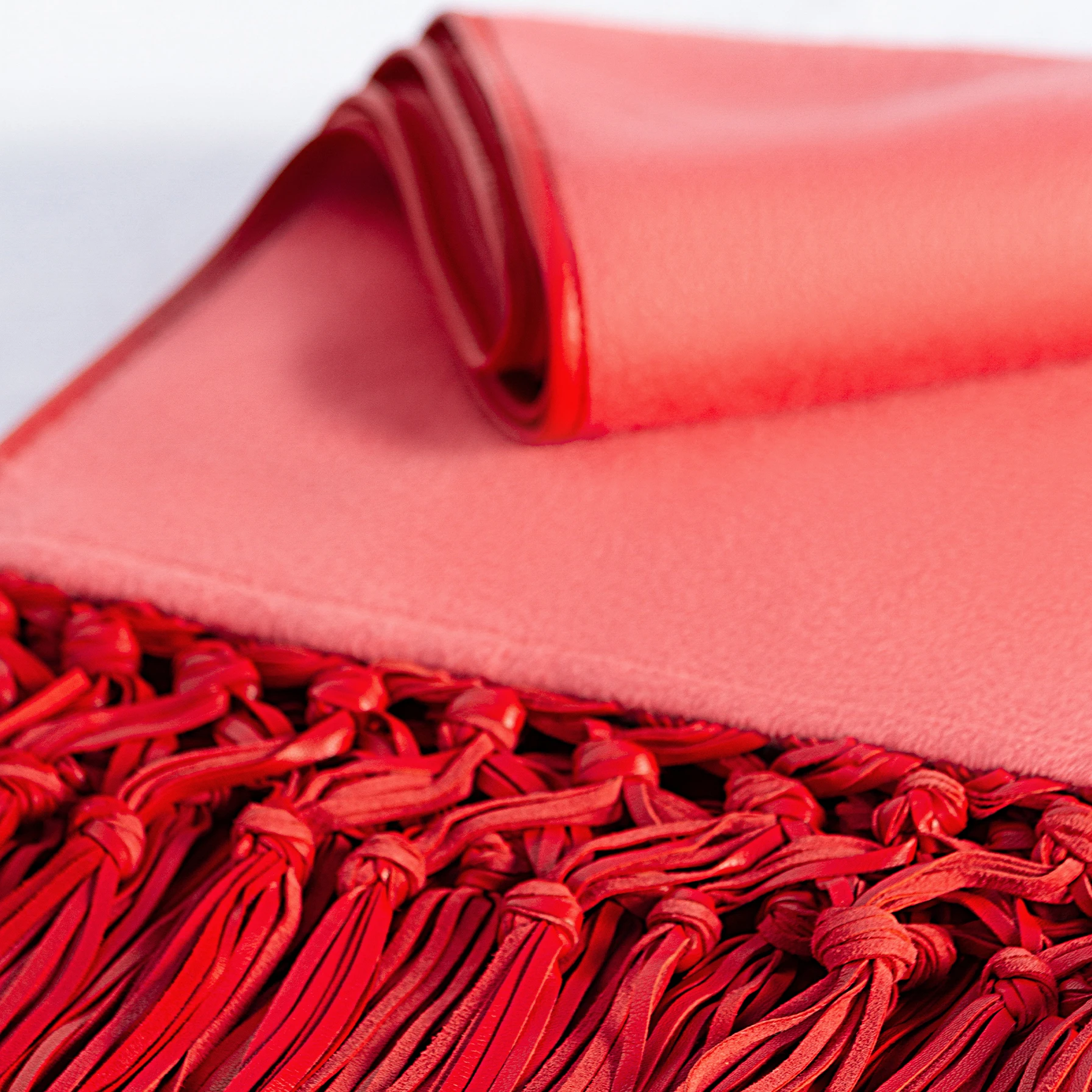 Cashmere Oversized Scarf in Salmon with Napa Leather Fringes, 200x70cm