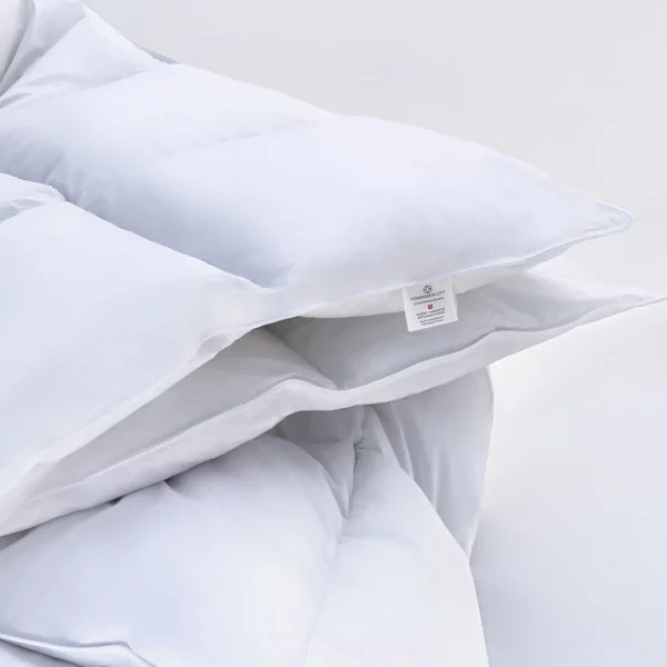 Made in Switzerland | 90% Swiss Goose down 10% Goose feather Artisanal Duvet Proudly Made in Switzerland in Forbidden City's atelier petits mains finished by hand with the finest Swiss traditional techniques, you will rest well under 90% goose down and 10% goose feather blend in an expertly stitched, multi-chamber, durable white cotton duvet. A masterpiece that becomes your best friend. Available in many pre-set sizes and also by custom order (size, down filling % and summer/winter weights) when you contact us. Experience the difference of Swiss quality and our five year guarantee*.